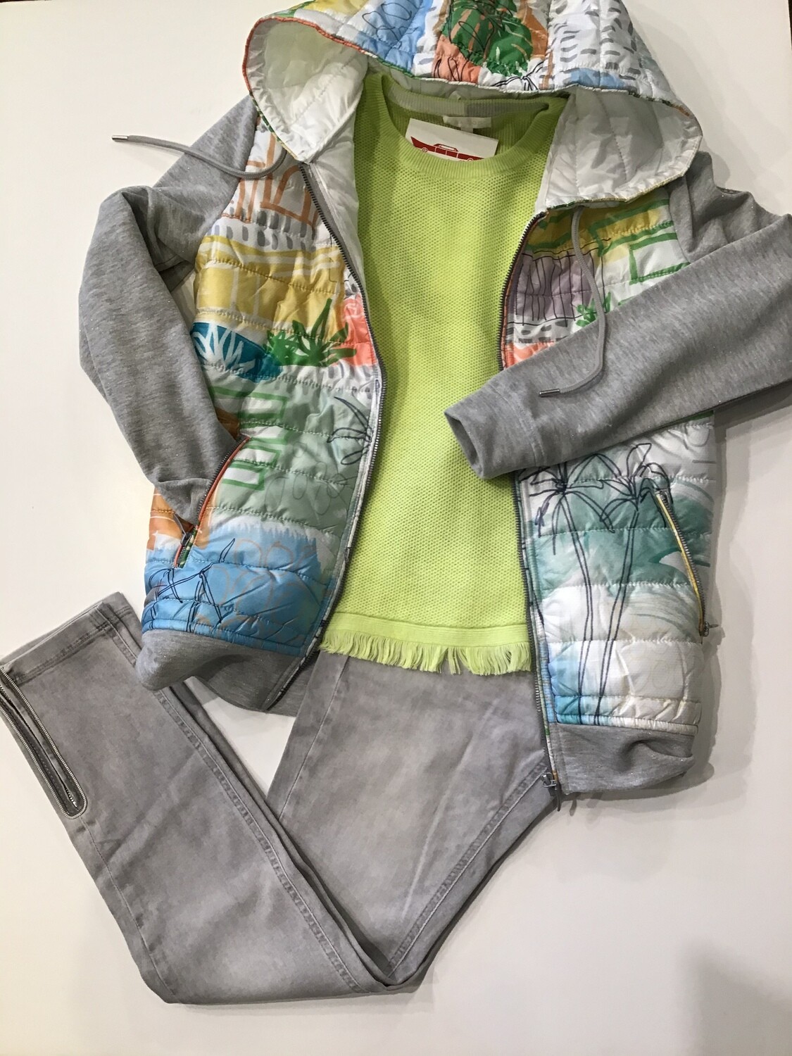 This sporty and fun hoodie has knit sleeves and back with a slight hint of sparkle to spice,it,up,along with the print puffer front and hood.